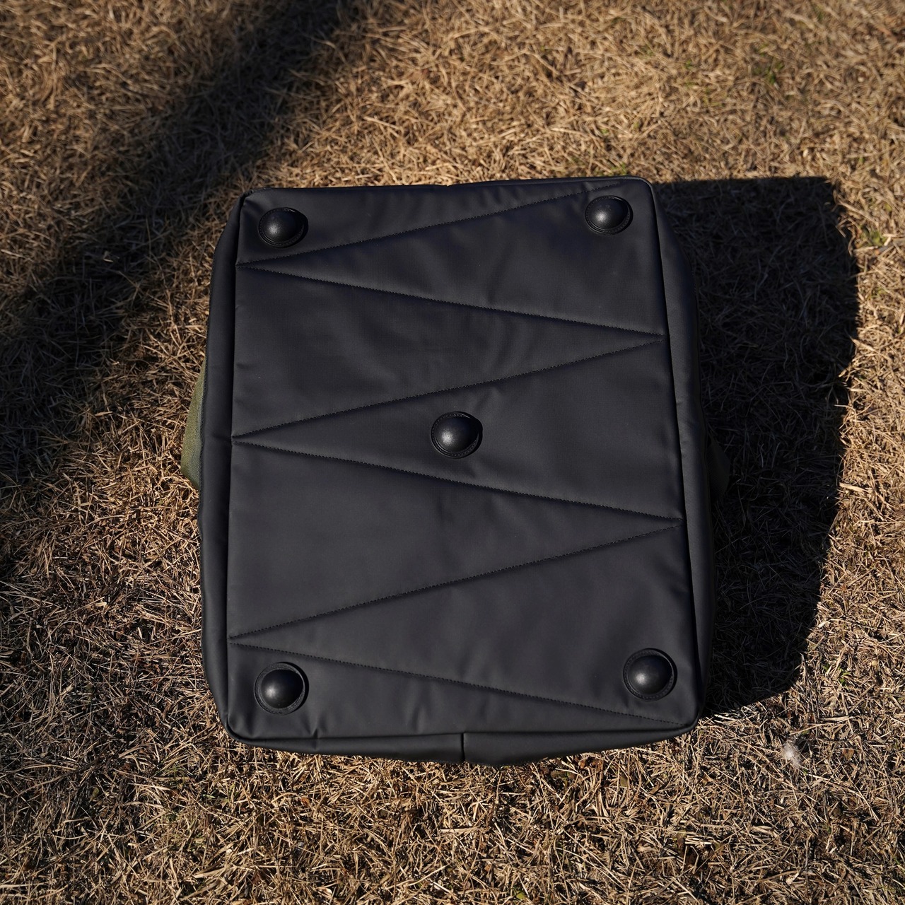 ボトム部分には防水素材のターポリンを使用。足も付いているので地面に直接置いても汚れが付きにくい仕様となっています。