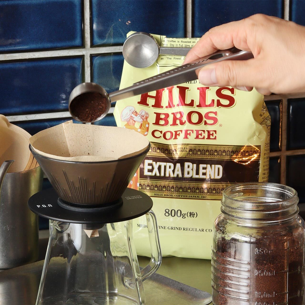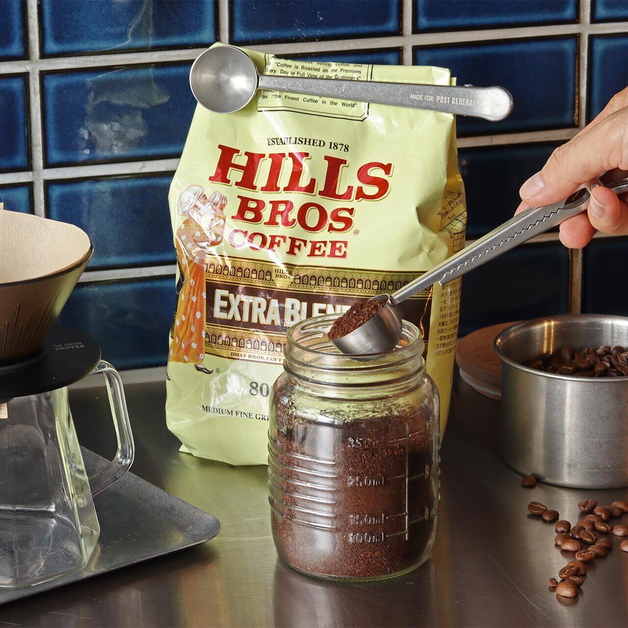 スプーンすり切り1杯で約8gのコーヒー粉を量ることができ、そのままクリップで袋の封ができるので、忙しい朝に便利なアイテムです。