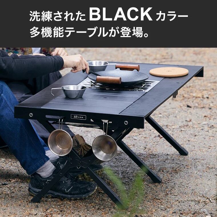 マットな質感のアルミ天板に、サイドには落ち着いた色味のウッドフレームを採用。オールブラックのギアで揃えたサイトはもちろん、アースカラー主体のサイトにもピリッとしたアクセントを加え、全体の雰囲気を格上げします。