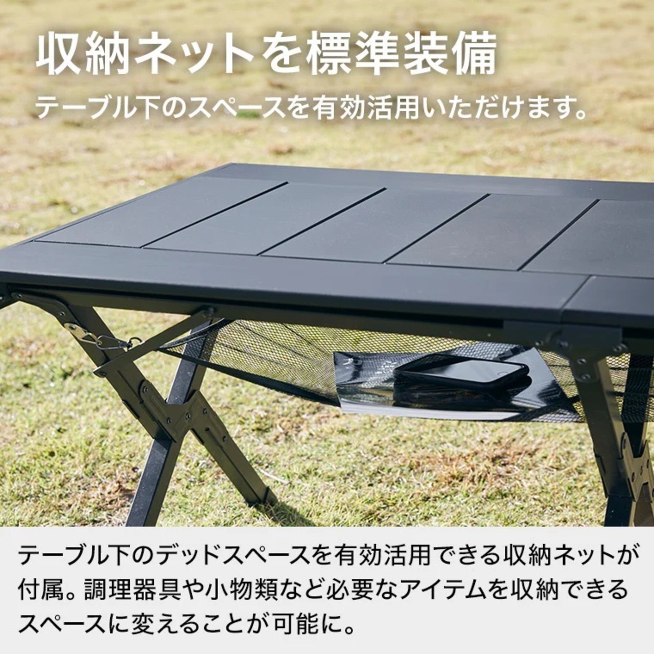 天板サイズは約115cm × 60cm。ファミリーやグループでの使用でも、大皿料理やドリンク、ランタンなどを置いても十分なスペースを確保しました。レイアウトを気にせず、広々と食事を楽しめます。